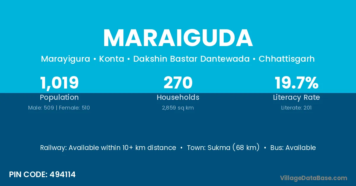 Sukma (68 km) is the nearest town to Maraiguda village for major economic activities and is located approximately 68 km away.