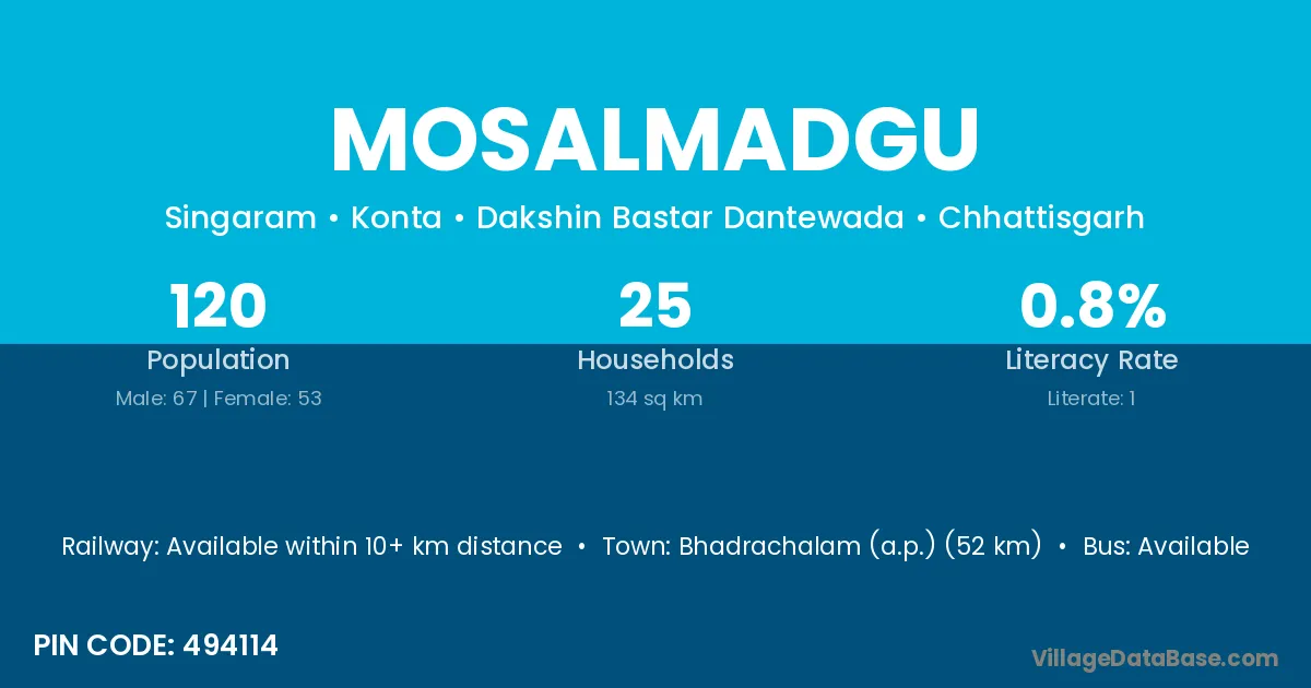 Mosalmadgu village has a total population of 120 people, of which 67 are males and 53 are females.