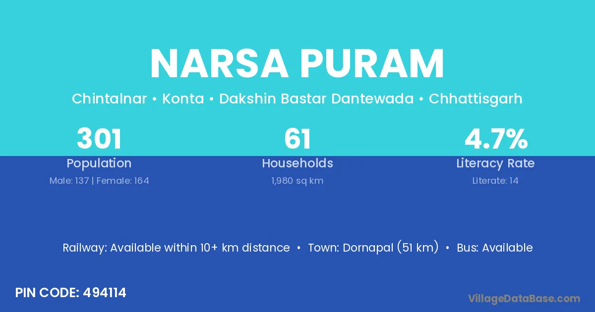 Dornapal (51 km) is the nearest town to Narsa Puram village for major economic activities and is located approximately 51 km away.