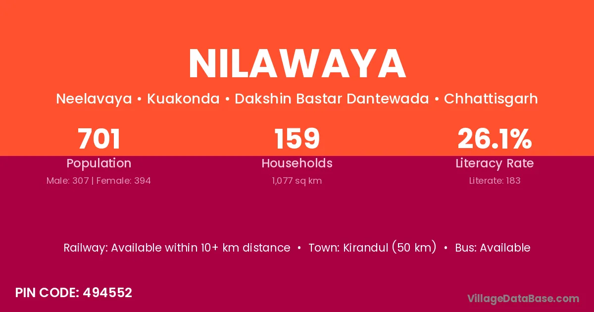 Dornapal (22 km) is the nearest town to Nilawaya village for major economic activities and is located approximately 22 km away.