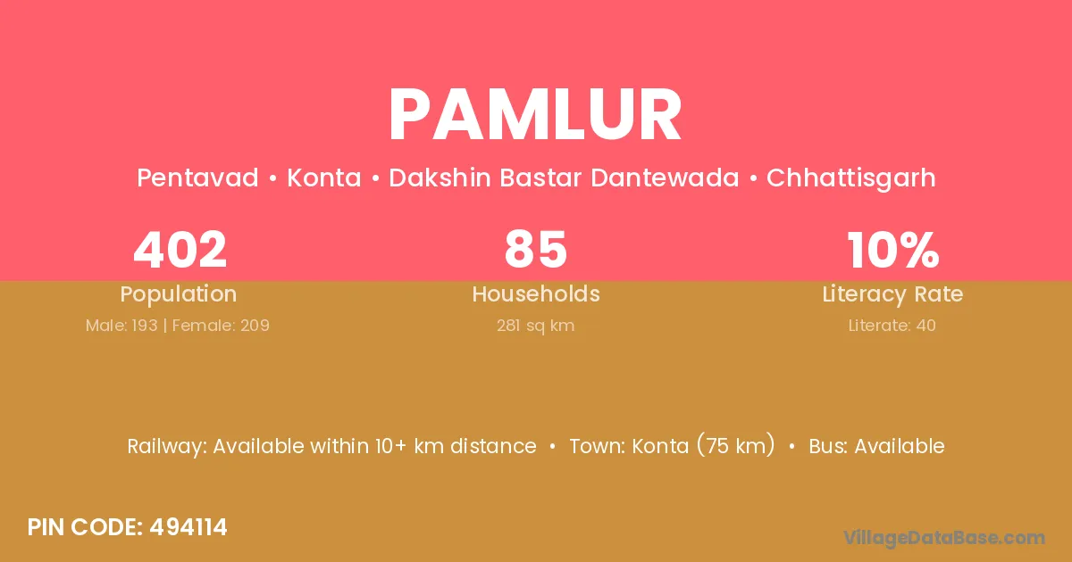 Konta (75 km) is the nearest town to Pamlur village for major economic activities and is located approximately 75 km away.