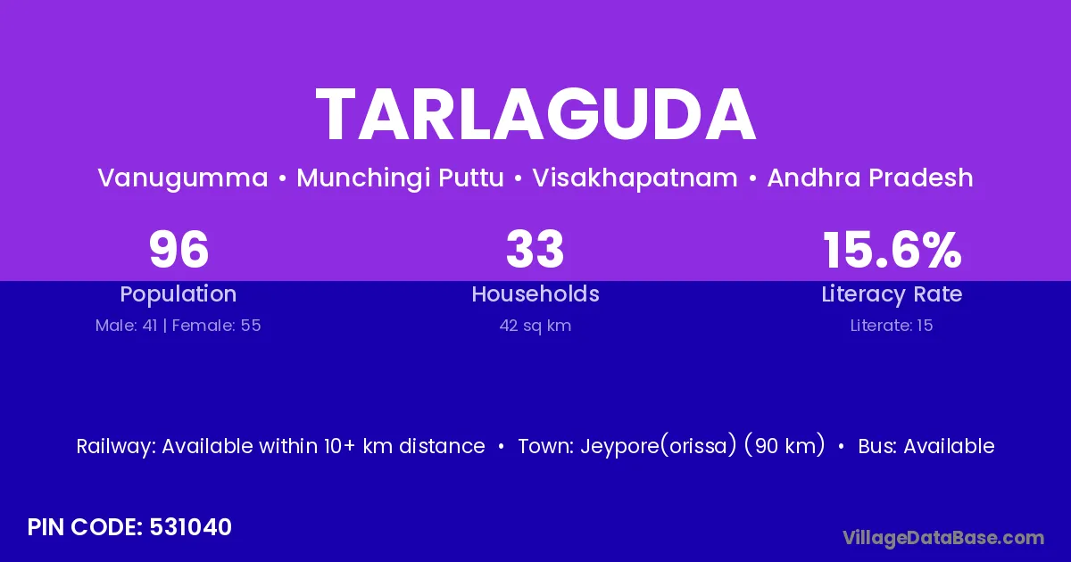 The literacy rate of Tarlaguda village is 1.48%. Male literacy stands at 2.73% and female literacy at 0.00%.