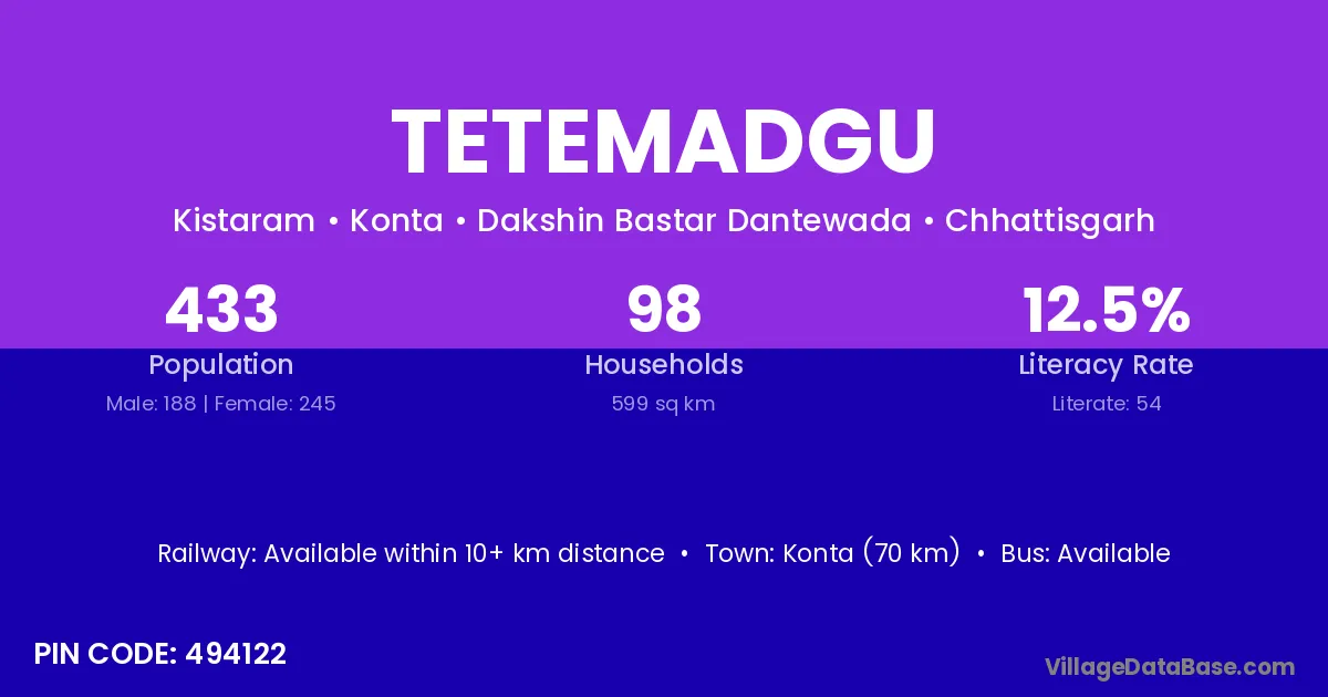 According to Census 2011 information, the village code of Tetemadgu village is 494122.