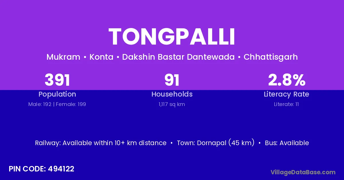According to Census 2011 information, the village code of Tongpalli village is 494122.