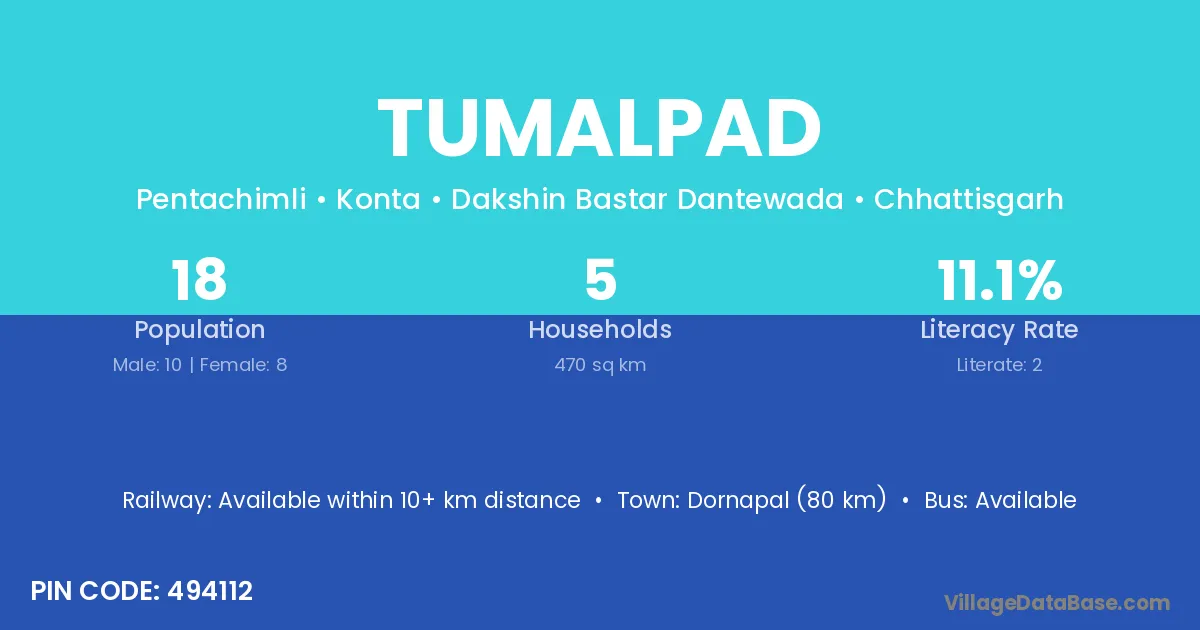 Dornapal (80 km) is the nearest town to Tumalpad village for major economic activities and is located approximately 80 km away.