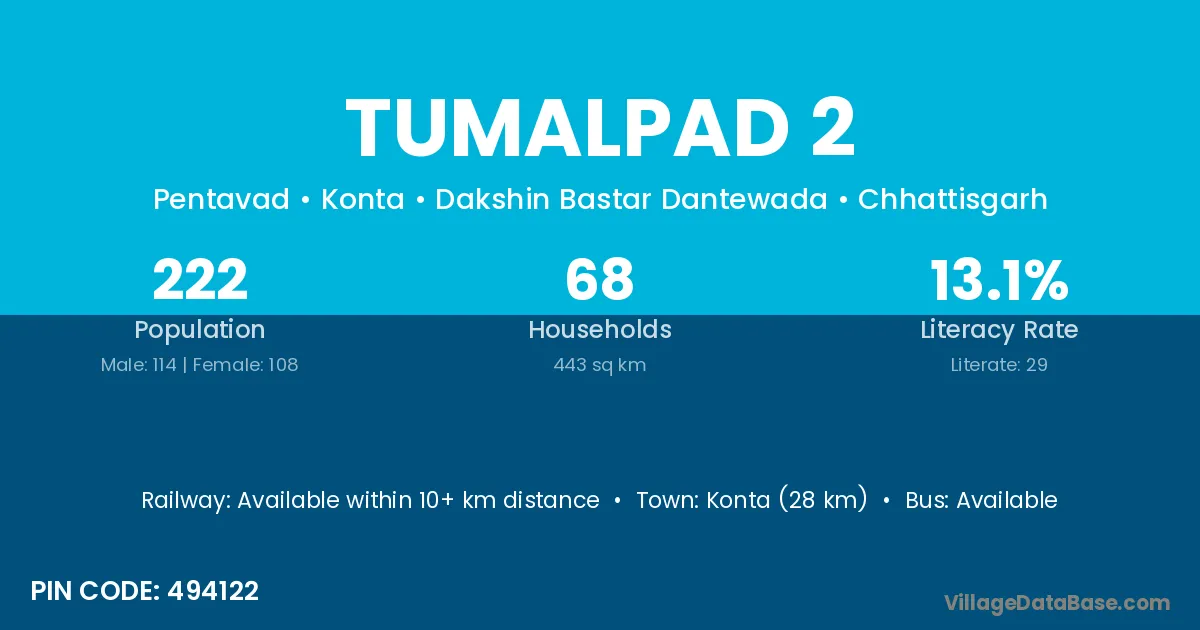 Tumalpad 2 village has a total population of 222 people, of which 114 are males and 108 are females.