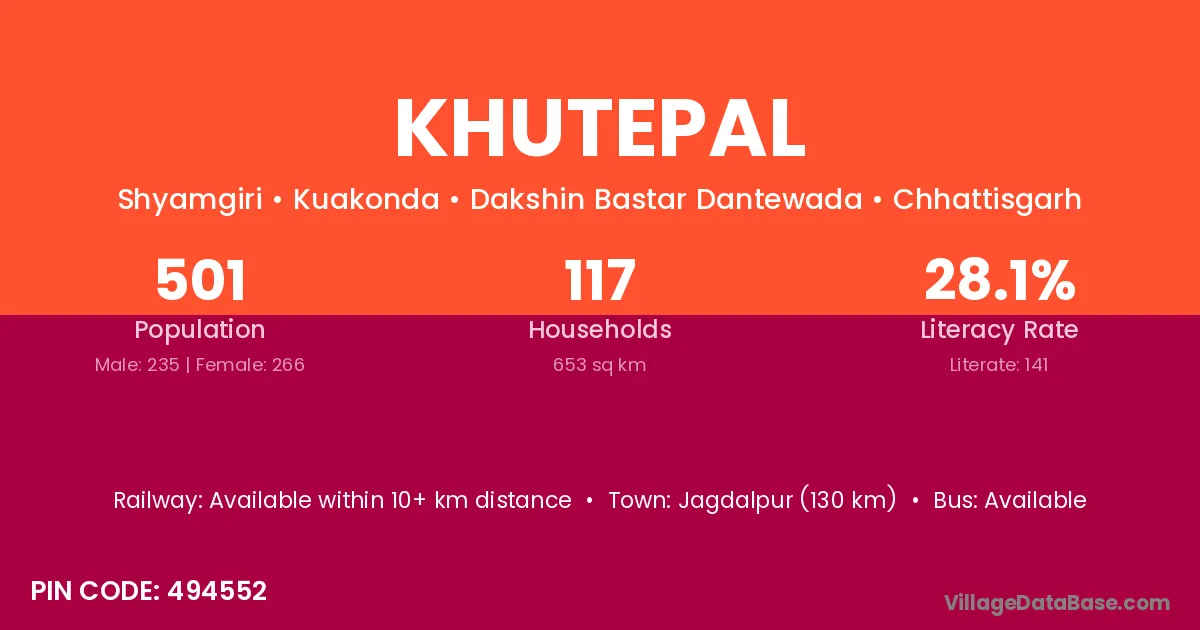 Jagdalpur (130 km) is the nearest town to Khutepal village for major economic activities and is located approximately 130 km away.