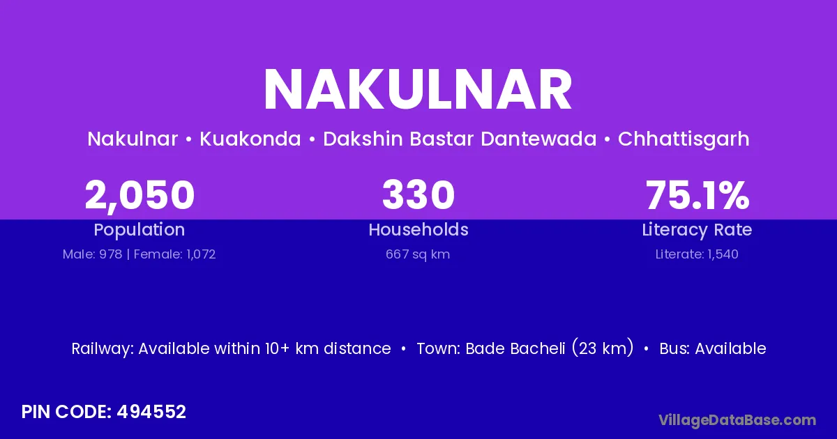 Bade Bacheli (23 km) is the nearest town to Nakulnar village for major economic activities and is located approximately 23 km away.