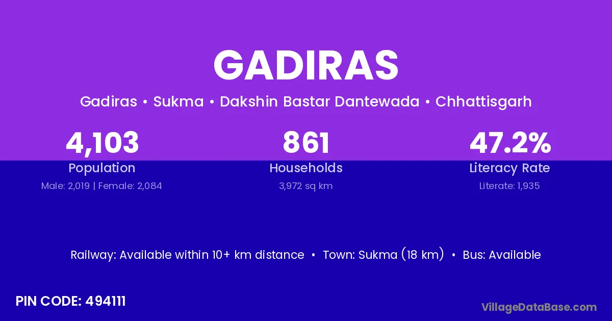 Sukma (18 km) is the nearest town to Gadiras village for major economic activities and is located approximately 18 km away.