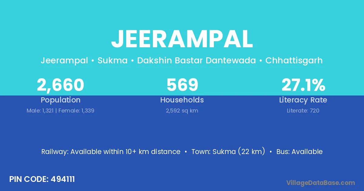 Sukma (22 km) is the nearest town to Jeerampal village for major economic activities and is located approximately 22 km away.