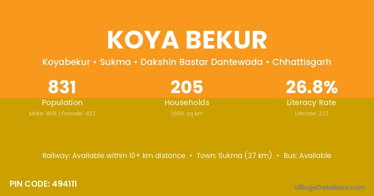 Sukma (27 km) is the nearest town to Koya Bekur village for major economic activities and is located approximately 27 km away.