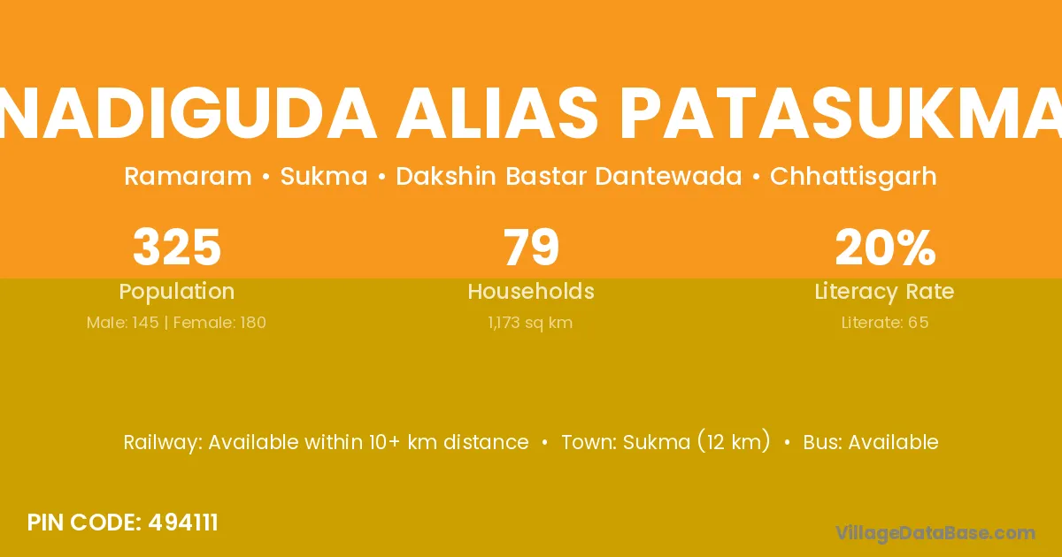 Sukma (12 km) is the nearest town to Nadiguda Alias Patasukma village for major economic activities and is located approximately 12 km away.