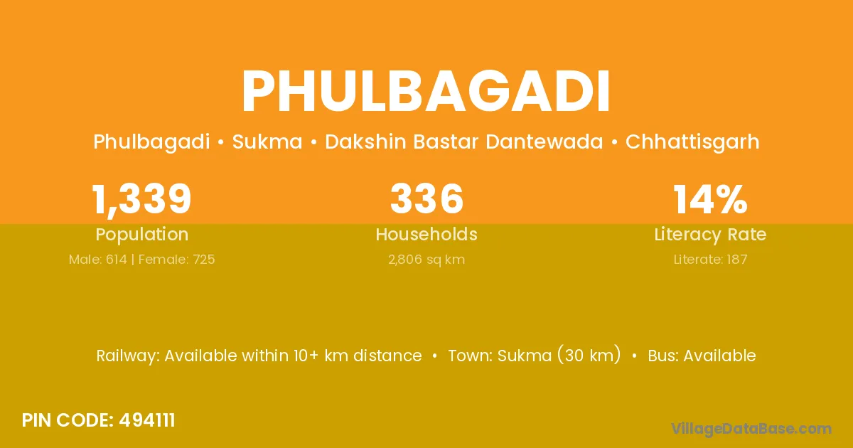 Sukma (30 km) is the nearest town to Phulbagadi village for major economic activities and is located approximately 30 km away.
