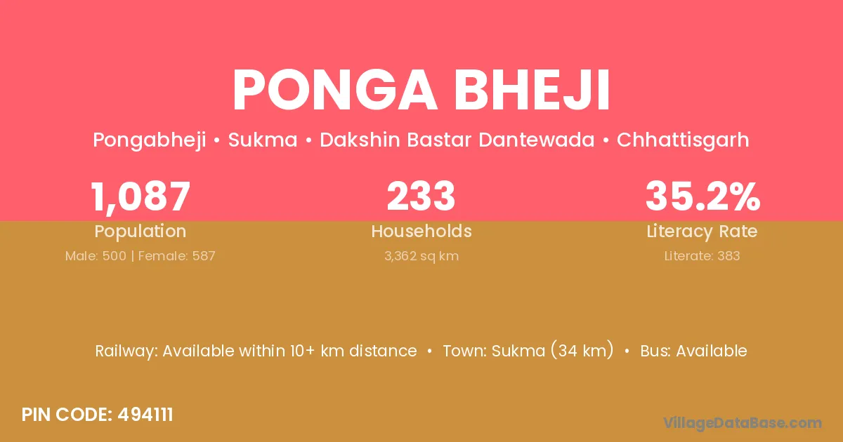 Sukma (34 km) is the nearest town to Ponga Bheji village for major economic activities and is located approximately 34 km away.