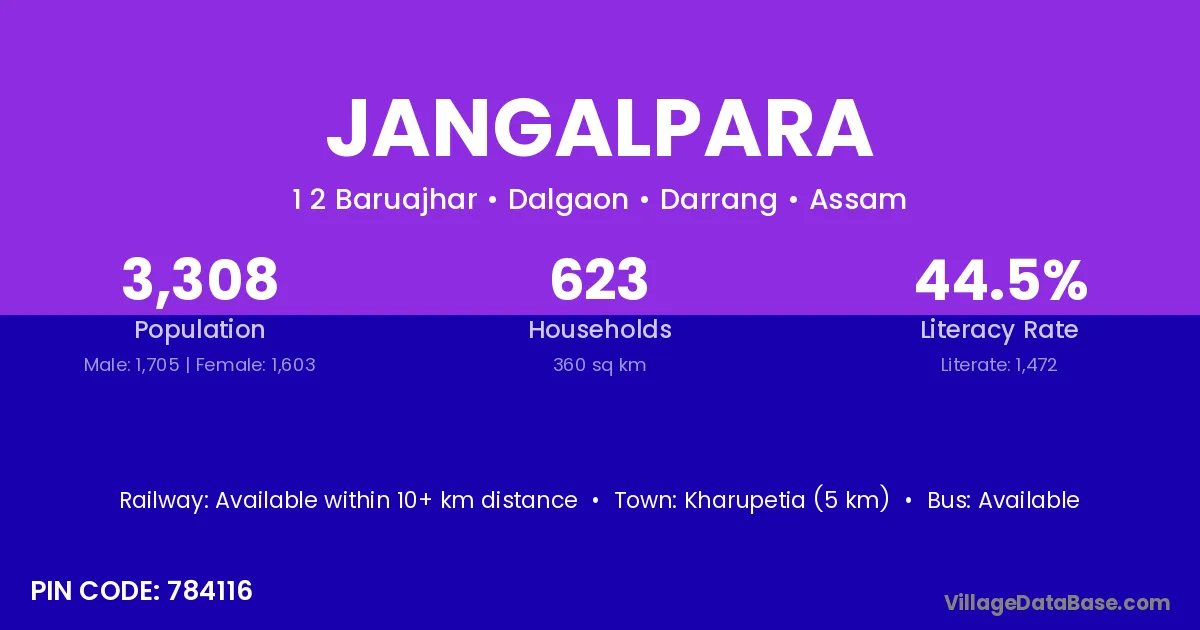 Dhamtari (55 km) is the nearest town to Jangalpara village for major economic activities and is located approximately 55 km away.