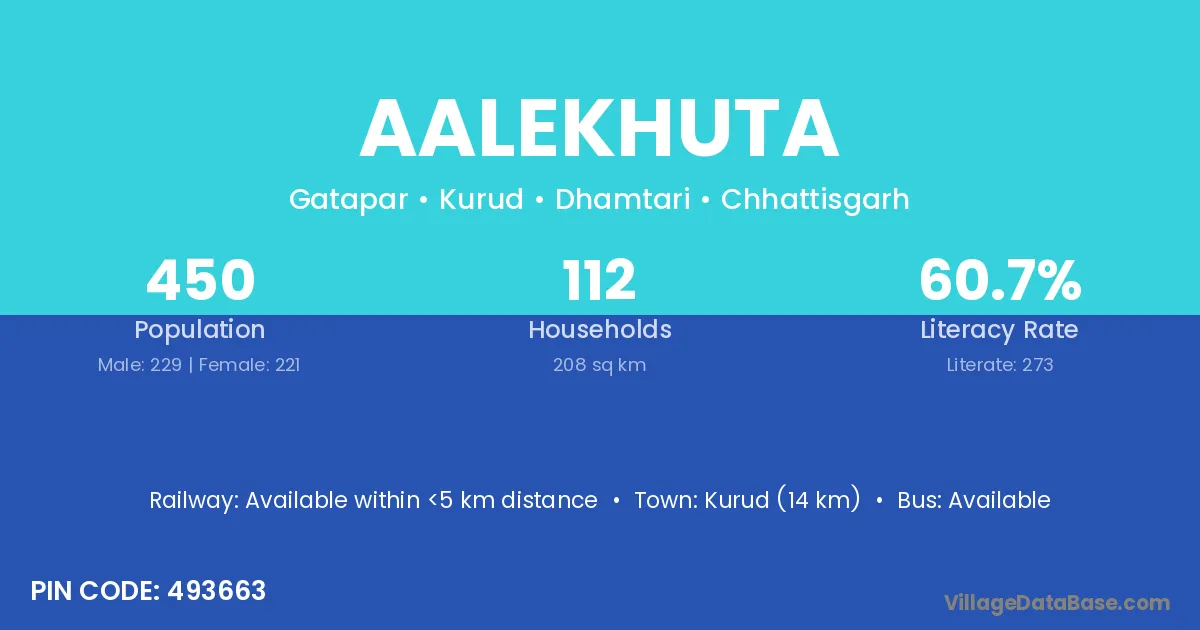 Kurud (14 km) is the nearest town to Aalekhuta village for major economic activities and is located approximately 14 km away.