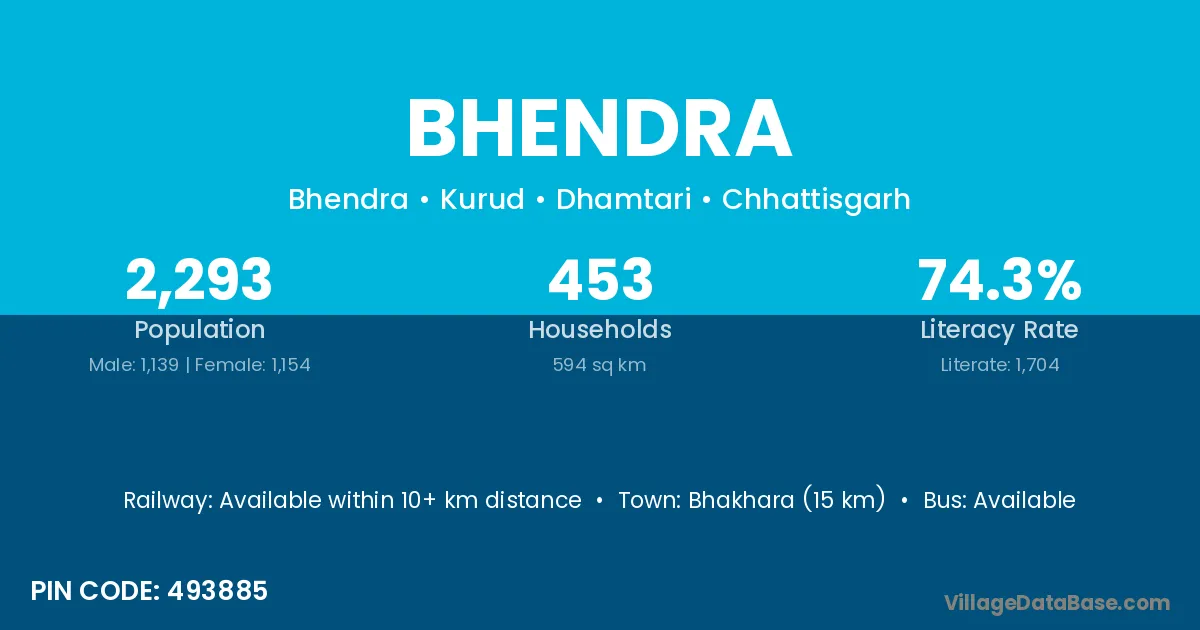 Bhakhara (15 km) is the nearest town to Bhendra village for major economic activities and is located approximately 15 km away.