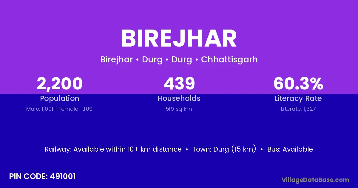 Kurud (17 km) is the nearest town to Birejhar village for major economic activities and is located approximately 17 km away.