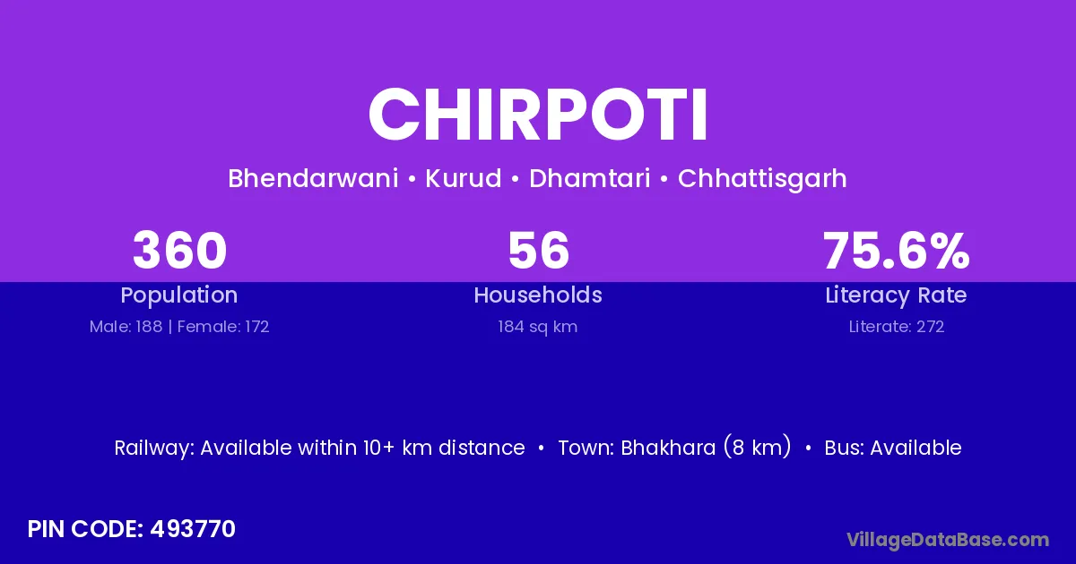 Bhakhara (8 km) is the nearest town to Chirpoti village for major economic activities and is located approximately 8 km away.