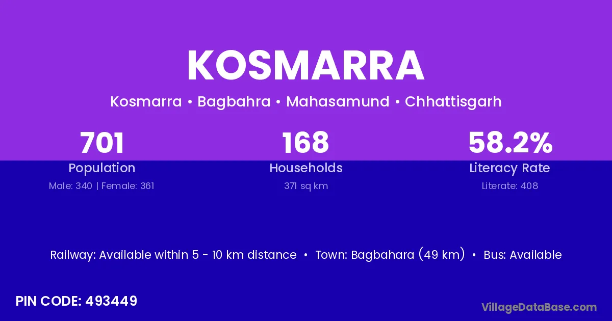 Bhakhara (4 km) is the nearest town to Kosmarra village for major economic activities and is located approximately 4 km away.