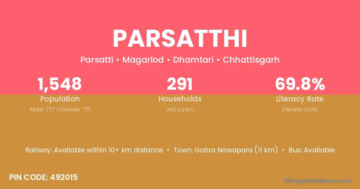 Kurud (20 km) is the nearest town to Parsatthi village for major economic activities and is located approximately 20 km away.