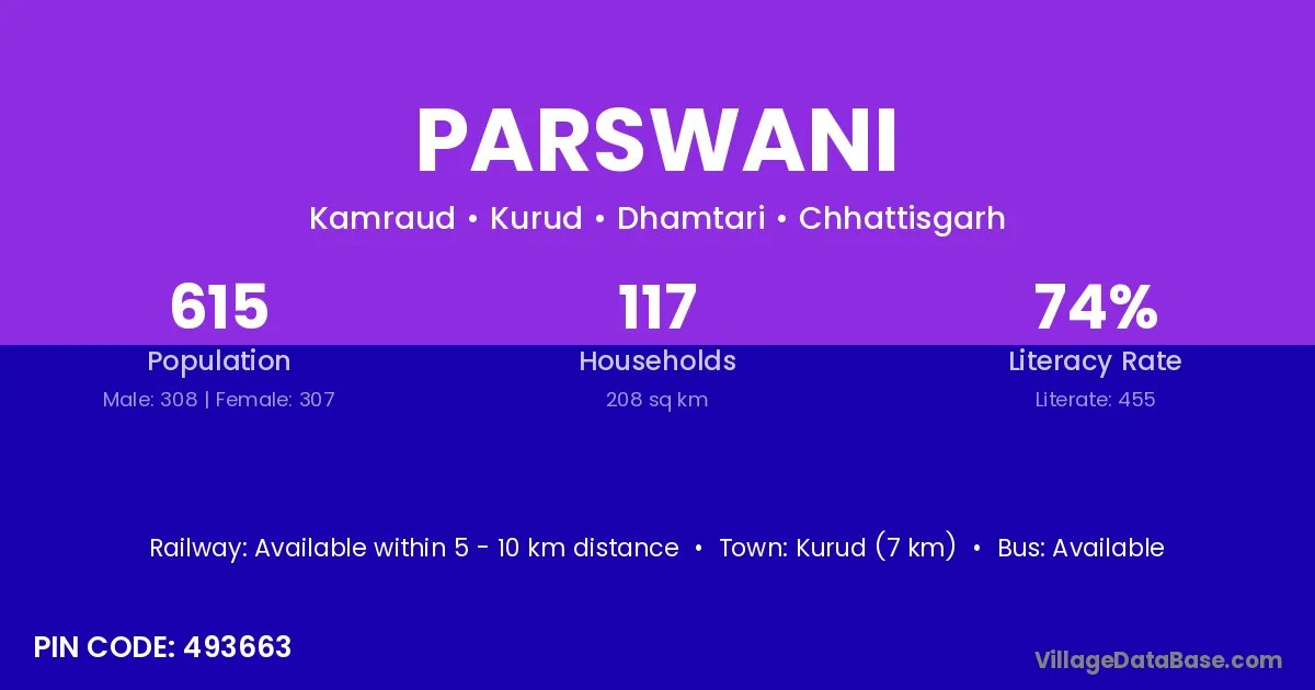 Kurud (7 km) is the nearest town to Parswani village for major economic activities and is located approximately 7 km away.