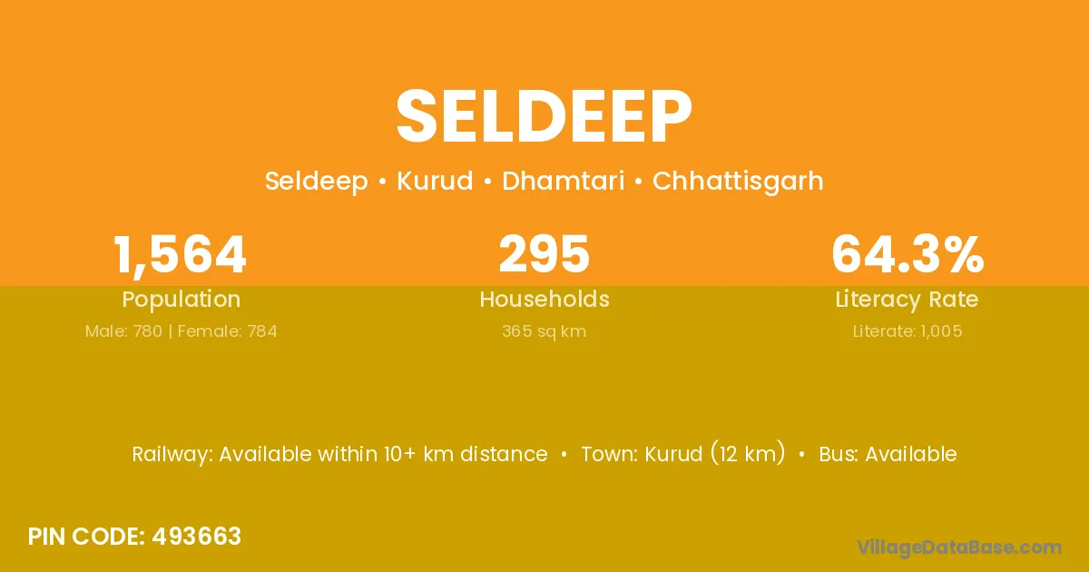 Kurud (12 km) is the nearest town to Seldeep village for major economic activities and is located approximately 12 km away.