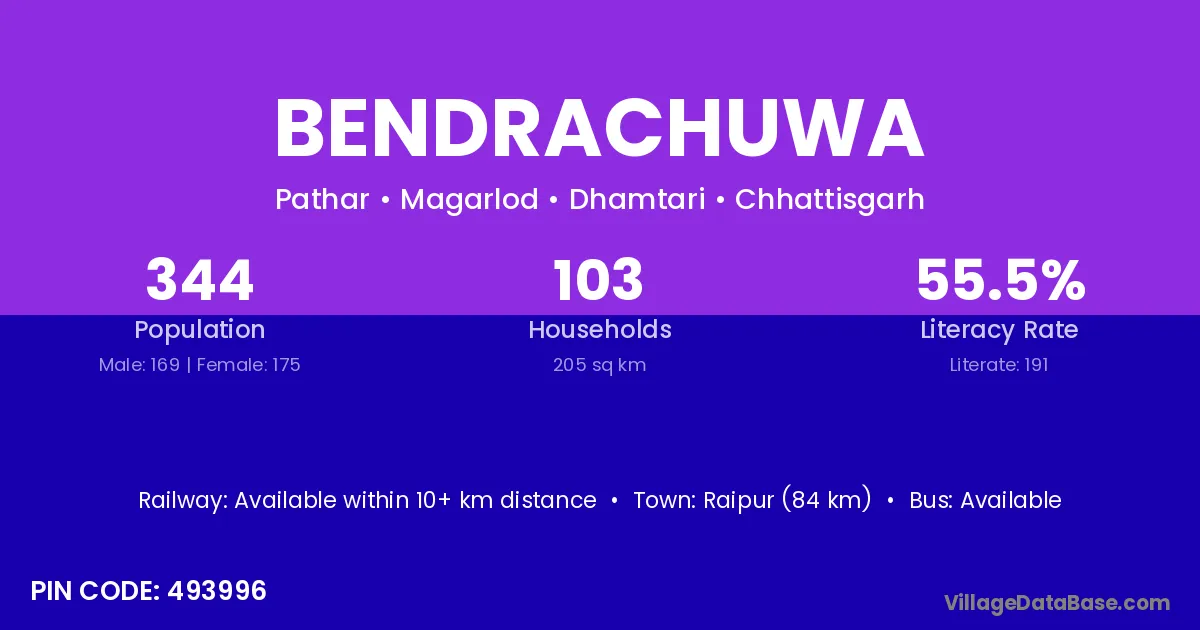 Raipur (84 km) is the nearest town to Bendrachuwa village for major economic activities and is located approximately 84 km away.