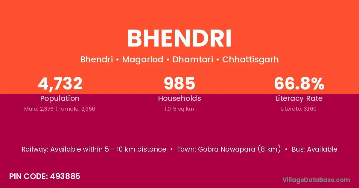 Gobra Nawapara (8 km) is the nearest town to Bhendri village for major economic activities and is located approximately 8 km away.