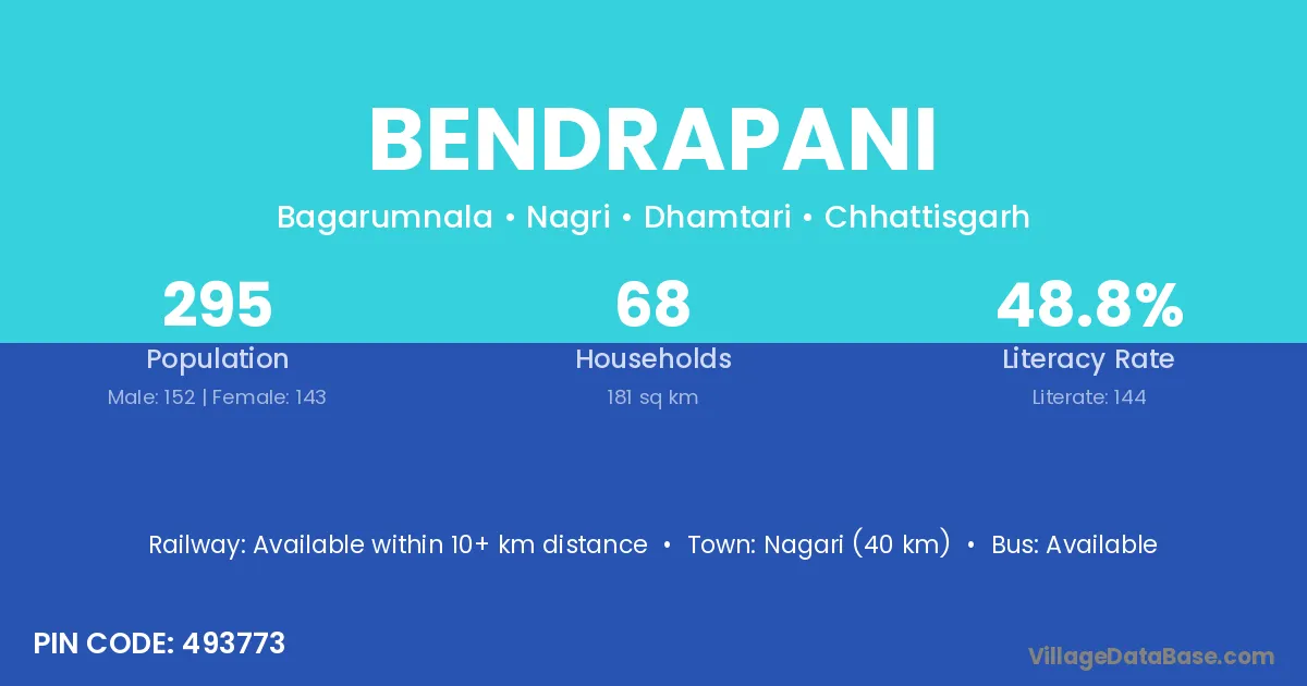 Bendrapani village has a total population of 295 people, of which 152 are males and 143 are females.