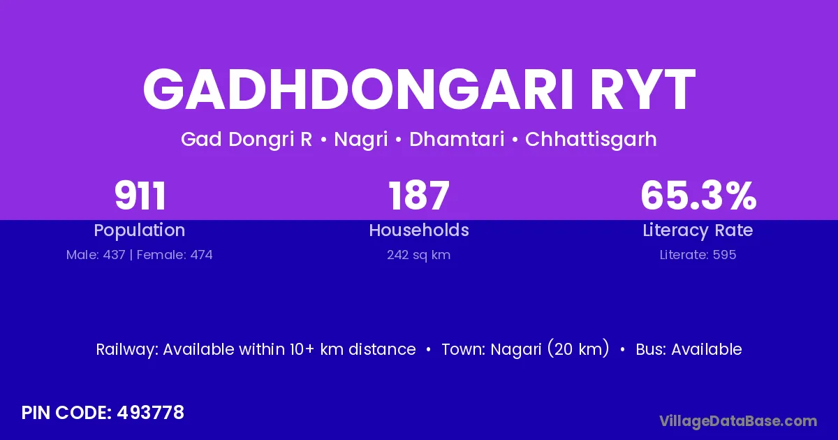 Nagari (20 km) is the nearest town to Gadhdongari Ryt village for major economic activities and is located approximately 20 km away.