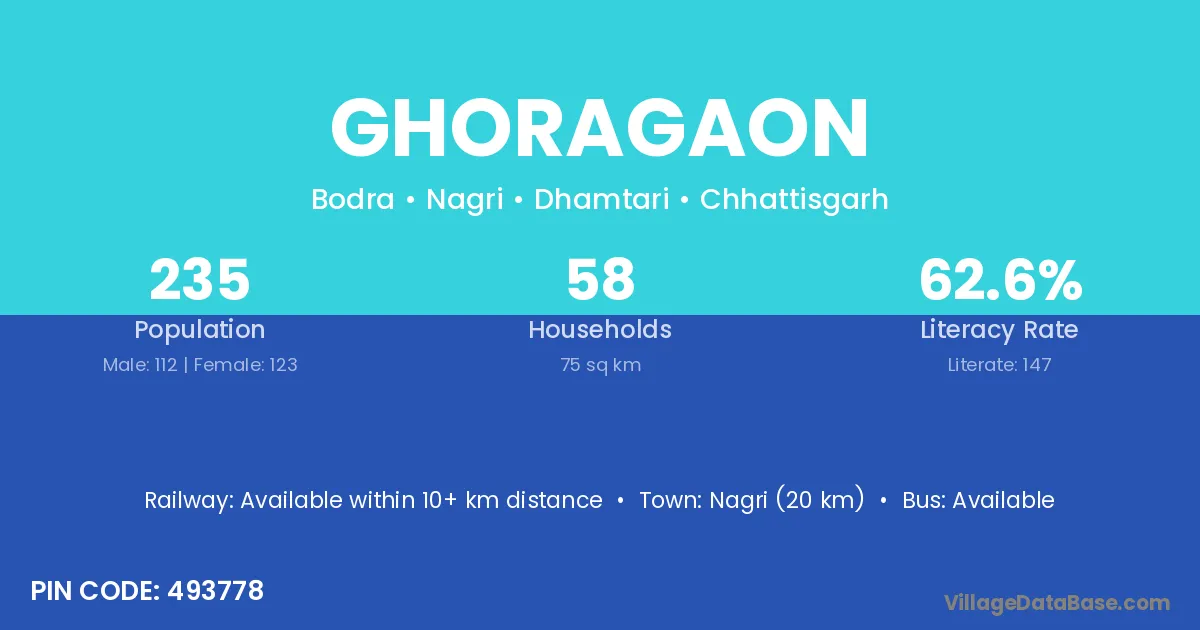 Nagri (20 km) is the nearest town to Ghoragaon village for major economic activities and is located approximately 20 km away.
