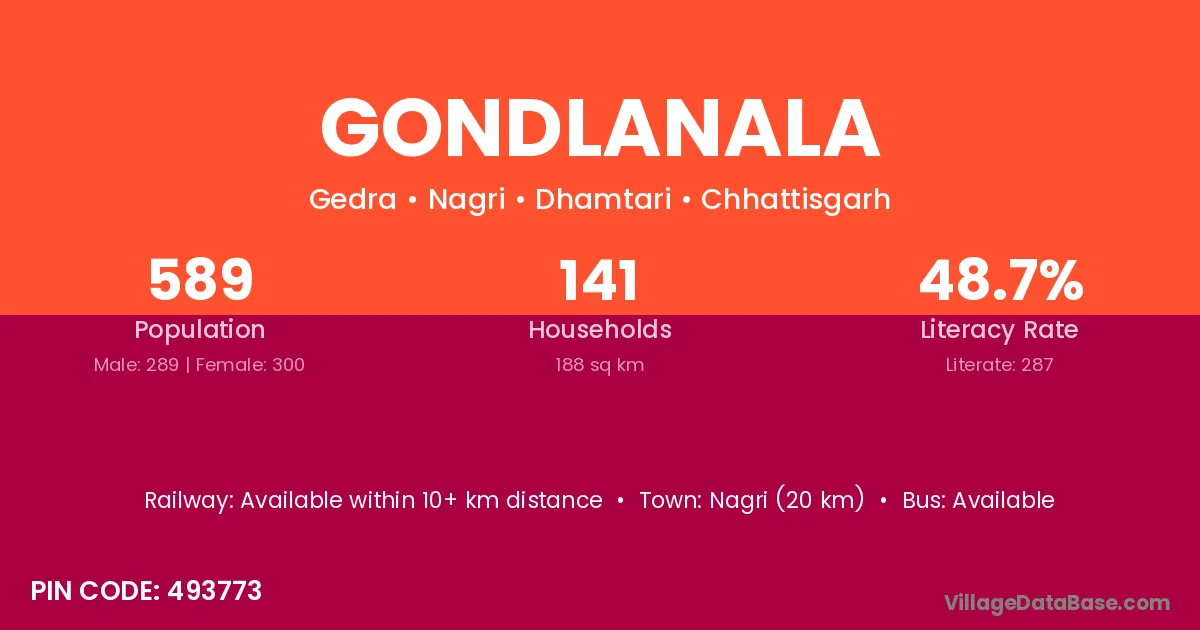 Nagri (20 km) is the nearest town to Gondlanala village for major economic activities and is located approximately 20 km away.
