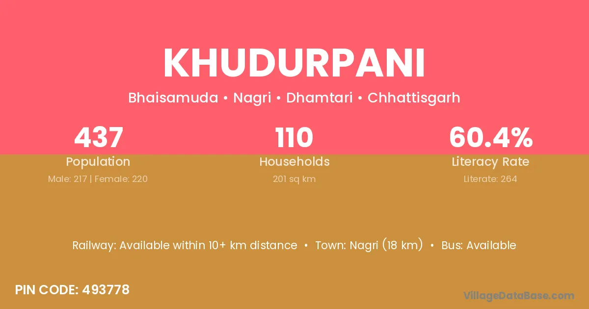 Nagri (18 km) is the nearest town to Khudurpani village for major economic activities and is located approximately 18 km away.