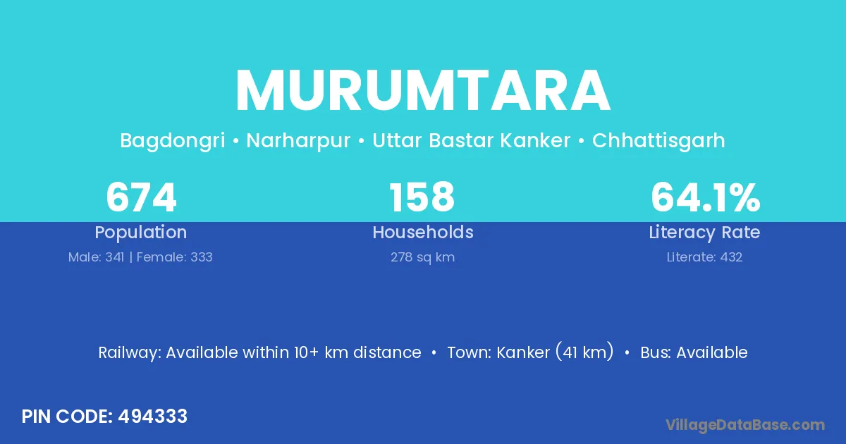 Nagri (30 km) is the nearest town to Murumtara village for major economic activities and is located approximately 30 km away.