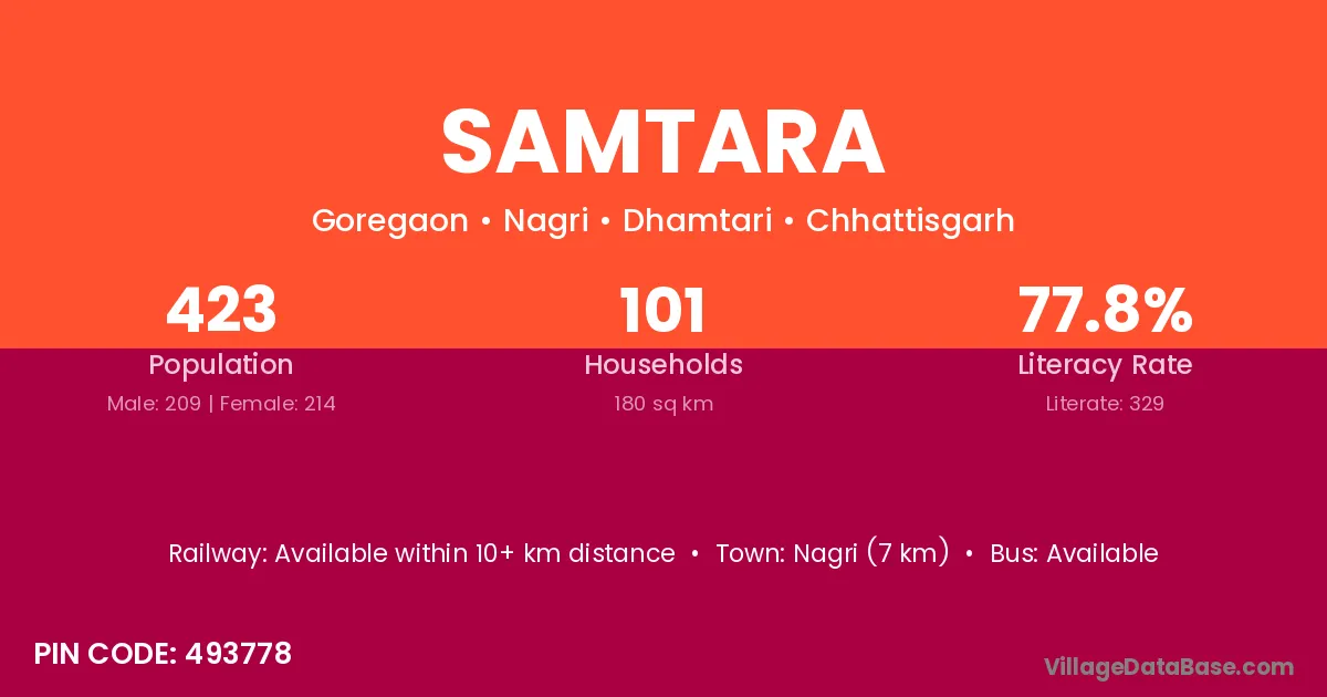Nagri (7 km) is the nearest town to Samtara village for major economic activities and is located approximately 7 km away.