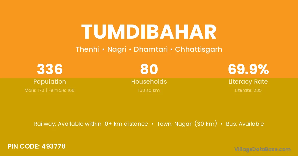 Nagari (30 km) is the nearest town to Tumdibahar village for major economic activities and is located approximately 30 km away.
