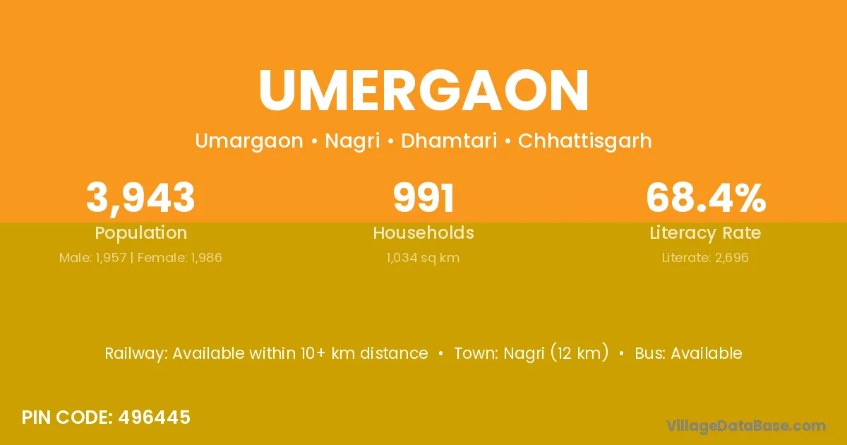 Nagri (12 km) is the nearest town to Umergaon village for major economic activities and is located approximately 12 km away.