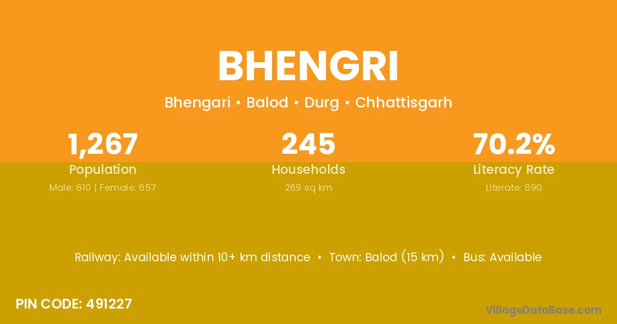 Balod (15 km) is the nearest town to Bhengri village for major economic activities and is located approximately 15 km away.