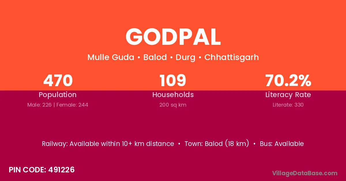 Balod (18 km) is the nearest town to Godpal village for major economic activities and is located approximately 18 km away.