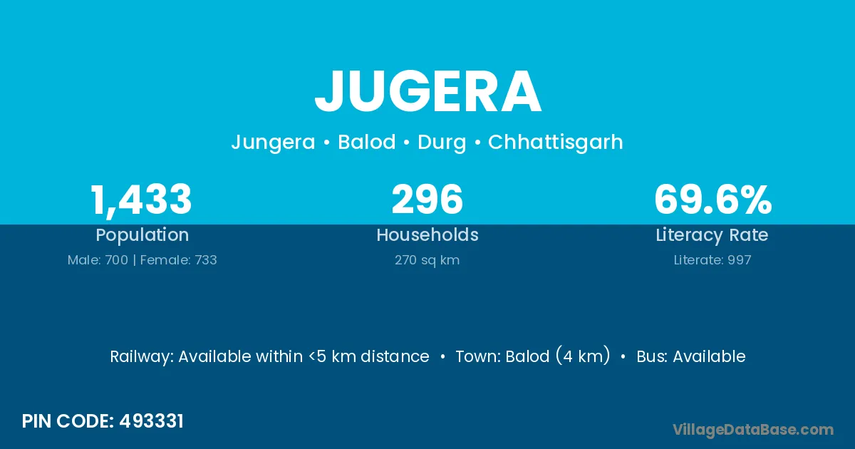 Balod (4 km) is the nearest town to Jugera village for major economic activities and is located approximately 4 km away.