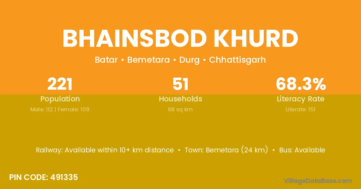 Bemetara (24 km) is the nearest town to Bhainsbod Khurd village for major economic activities and is located approximately 24 km away.