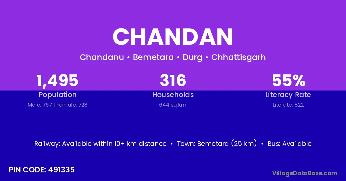 Bemetara (25 km) is the nearest town to Chandan village for major economic activities and is located approximately 25 km away.