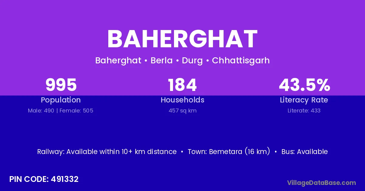 Bemetara (16 km) is the nearest town to Baherghat village for major economic activities and is located approximately 16 km away.