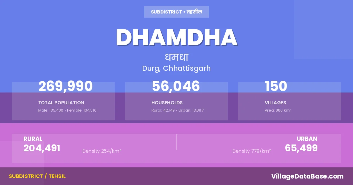 According to the 2011 census The total area of Dhamdha Tehsil is 888 km², with a population of 269990 people. The population density is 304 inhabitants per square kilometre, and there are approximately 56046 houses in the sub district.