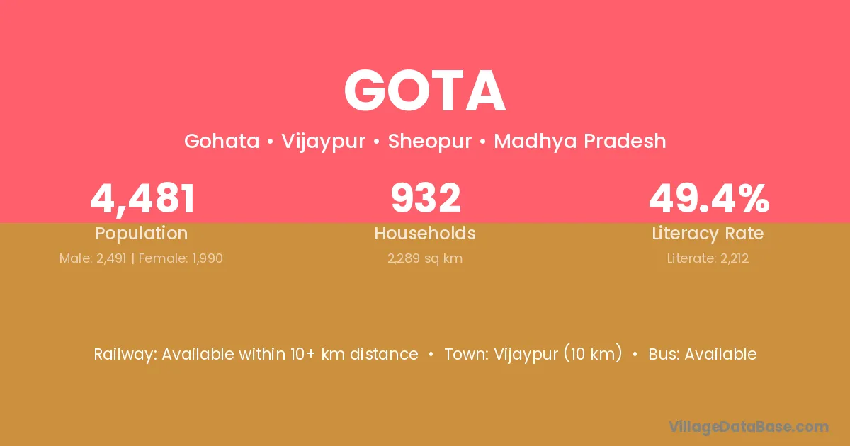 The literacy rate of Gota village is 59.25%. Male literacy stands at 69.28% and female literacy at 49.94%.