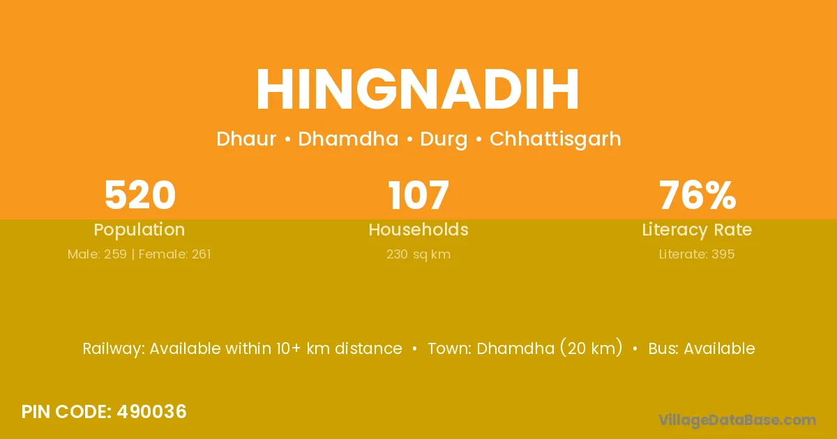 Dhamdha (20 km) is the nearest town to Hingnadih village for major economic activities and is located approximately 20 km away.