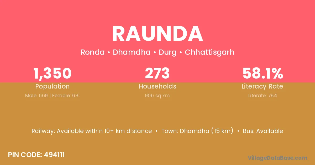 Dhamdha (15 km) is the nearest town to Raunda village for major economic activities and is located approximately 15 km away.