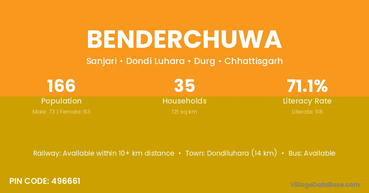 Dondiluhara (14 km) is the nearest town to Benderchuwa village for major economic activities and is located approximately 14 km away.