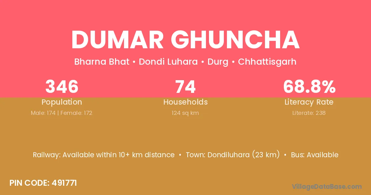 Dondiluhara (23 km) is the nearest town to Dumar Ghuncha village for major economic activities and is located approximately 23 km away.